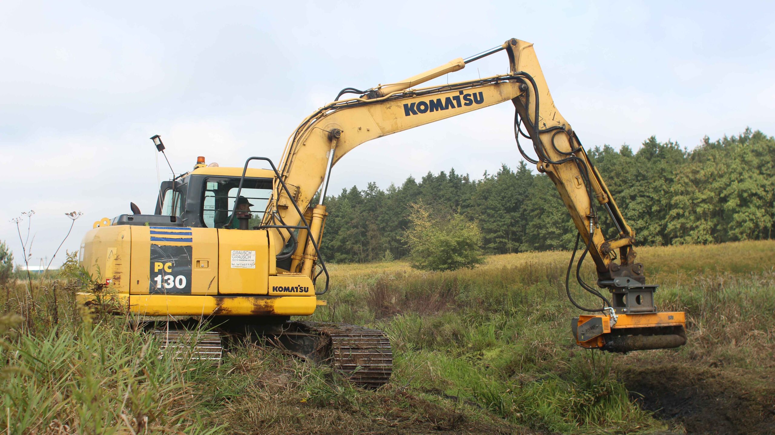 Eine weitere erfolgreiche Montage eines Schlegelmähers auf einem KOMATSU-#PC130-Bagger.