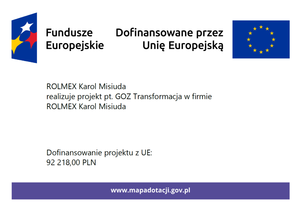 Projekt „GOZ Transformacja w firmie ROLMEX Karol Misiuda” jest realizowany przy wsparciu finansowym Unii Europejskiej. Firma otrzymała dofinansowanie w ramach programu Fundusze Europejskie dla Polski Wschodniej 2021-2027 Działanie Gospodarka o obiegu zamkniętym w MŚP – Etap I.